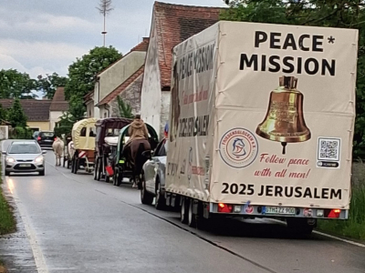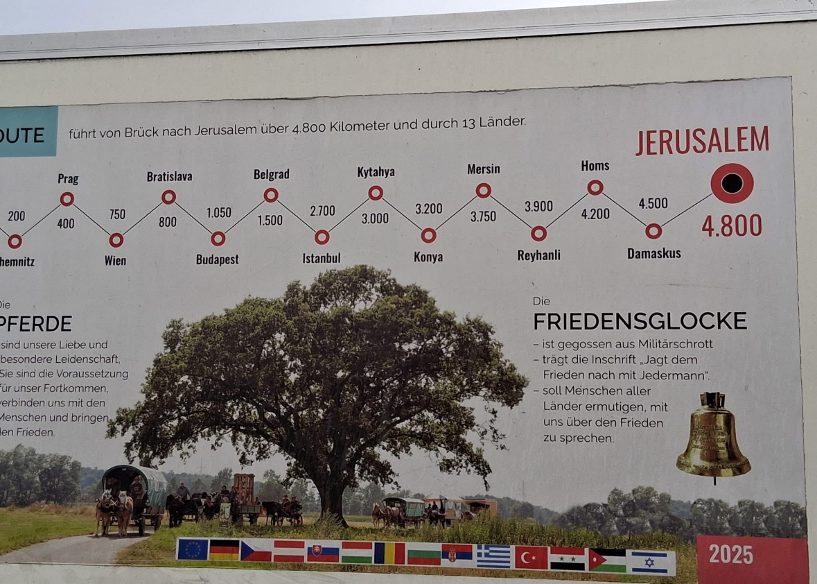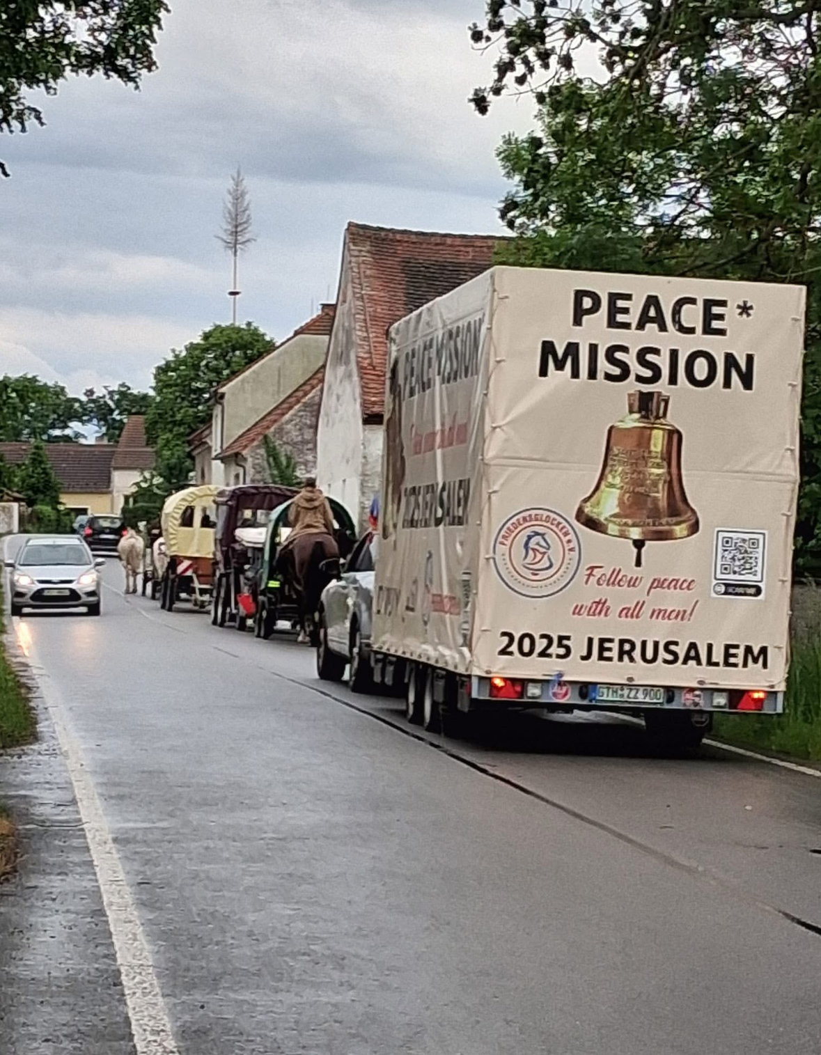 Působivý "Pochod za mír" spolku Friedensglocken e.V., který 8. května v Berlíně zahájil svou cestu do Jeruzaléma, překročil českou hranici v sobotu 24. května 2025. Průvod se čtyřmi kočáry, jedním jezdcem a celkem 13 koňmi, opustil Německo za Jöhstadtem a vjel do země, která jako málokterá jiná spoluvytvářela proměnlivou historii Evropy.