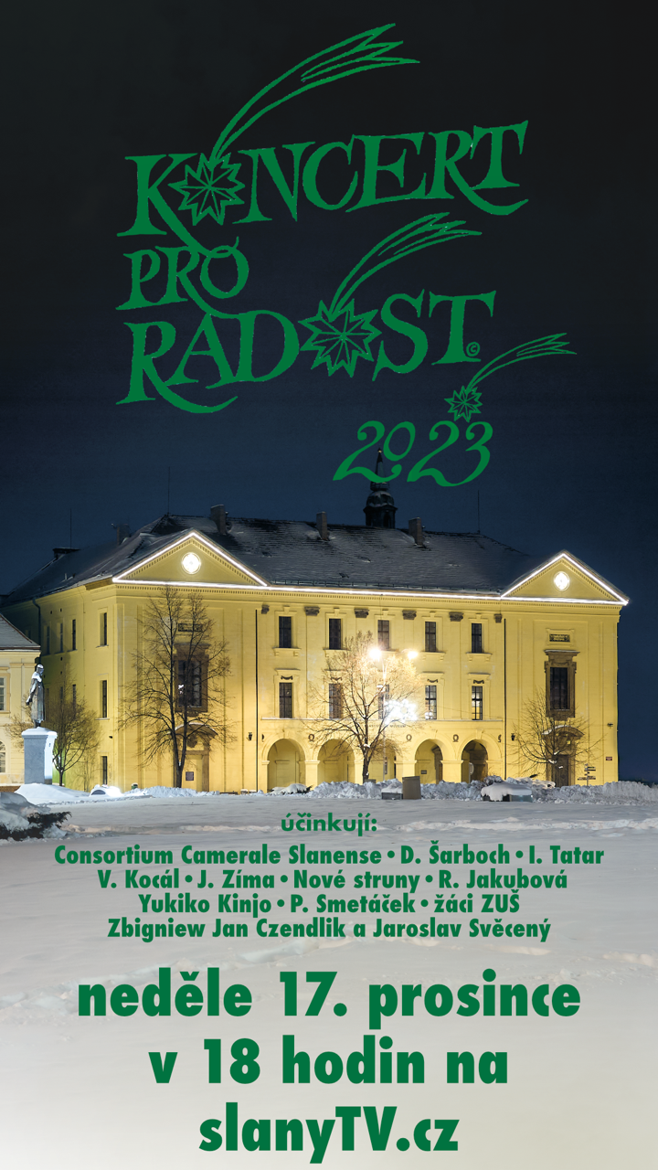 Koncert pro radost 2023 - účinkují: Consortium Camerale Slanense * D. Šarboch * I. Tatar * V. Kocál * J. Zíma * Nové struny * R. Jakubová * Yukiko Kinjo * P. Smetáček * žáci ZUŠ * Zbigniew Jan Czendlík a Jaroslav Svěcený