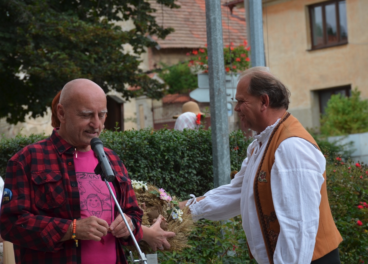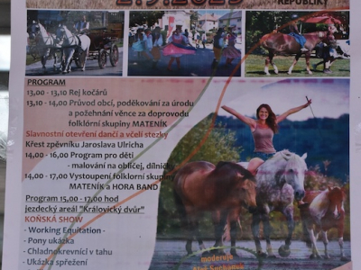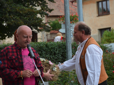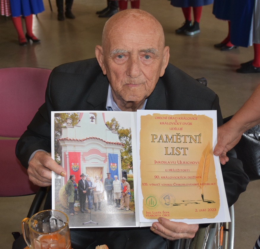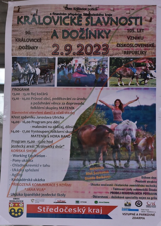 Navíc spojené se 105. výročím založení Československa, což letos připomínala limitovaná edice slánského piva Antoš s portréty našich prezidentů. Jako host k nám tradičně zavítala paní Věra Libichová, tajemnice Spolku pro obnovu venkova, dále paní Lucie Cirkva Chocholová, předsedkyně Výboru pro památkovou péči, kulturu a cestovní ruch Středočeského kraje, pan Ladislav Chlupáč – senátor a litoměřický patriot, místostarosta Královského města Slaný pan Radek Vondráček a také zástupce poctivých statkářů tradiční dynastie Nováků Pavel. U královické kapličky potom pan farář Cyril Kubánek v modlitbě poděkoval za úrodu a požehnal dožínkovému věnci. Stalo se už tradicí, že první písní v podání Hora Bandu a Estrádní skupiny z Pozdně je vždycky oblíbená píseň T.G. Masaryka “Ach synku synku“. Letos také pan farář slavnostně pokřtil zpěvník písní velkého doyena kultury v našem regionu – Járy Ulricha, který je ještě o čtyři roky starší než 90 let doložené tradice dožínek v Královicích! Mimo jiné je i autorem Královické hymny. Popravdě řečeno – Jára sklidil za svůj projev, a samozřejmě také za celoživotní práci v oblasti kultury, největší potlesk od všech přítomných. Hosté kromě dožínkových věnců a kazety z pivovaru Antoš dostali také pamětní listy, které tradičně připravil náš „písmák“ a badatel, autor mnoha knih o našem regionu Václav Valerián Kýzl. A já jako vyučený knihtiskař oceňuji excelentní práci, kterou odvedla tiskárna Domanja (www.tiskarnadomanja.cz). Ale tím program zdaleka nekončil! Kromě nových chodníků vybudovali v Královicích s pomocí Středočeského kraje dvě nové stezky pro pěší – Dančí stezku a Včelí stezku, která má 5 stanovišť se sladkou prémií na šesté zastávce, kterou je Královický dvůr s vyhlášenou gastronomií. A pochopitelně se známým koňáckým areálem, ve kterém čekal na hosty Královických dožínek strhující a pestrý program. To vše profesionálně moderoval Aleš Suchánek. Myslím, že občané Královic – i ti čestní občané, mezi které patří i pan prezident Václav Klaus a Lucie Bílá – mohou být na svoji obec pyšní. Na obec, která má starostu, který se opravdu umí starat – Luďka Šofra. A tak se nedivte, že jsem na začátku napsal, že moderovat v Královicích je radost!