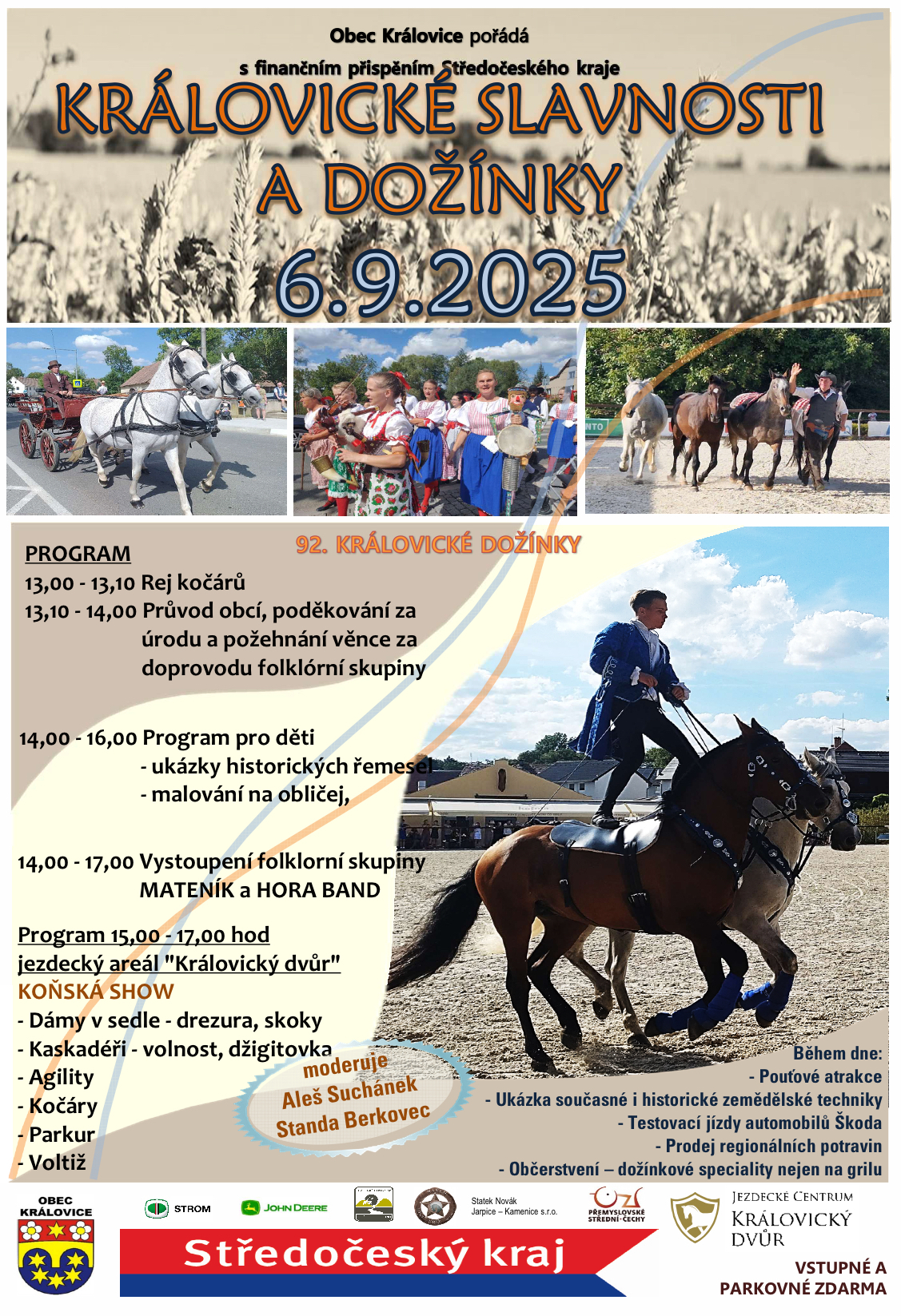 Obec Královice pořádá v sobotu 6. září 2025 tradiční "Královické slavnosti a dožínky". Program zahájí odpoledne rej kočárů, následovaný průvodem obcí, poděkováním za úrodu a požehnáním věnce za doprovodu folklorních skupin Mateník a Hora Band. Nebude chybět program pro děti, malování na obličej a dílničky.