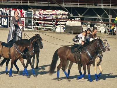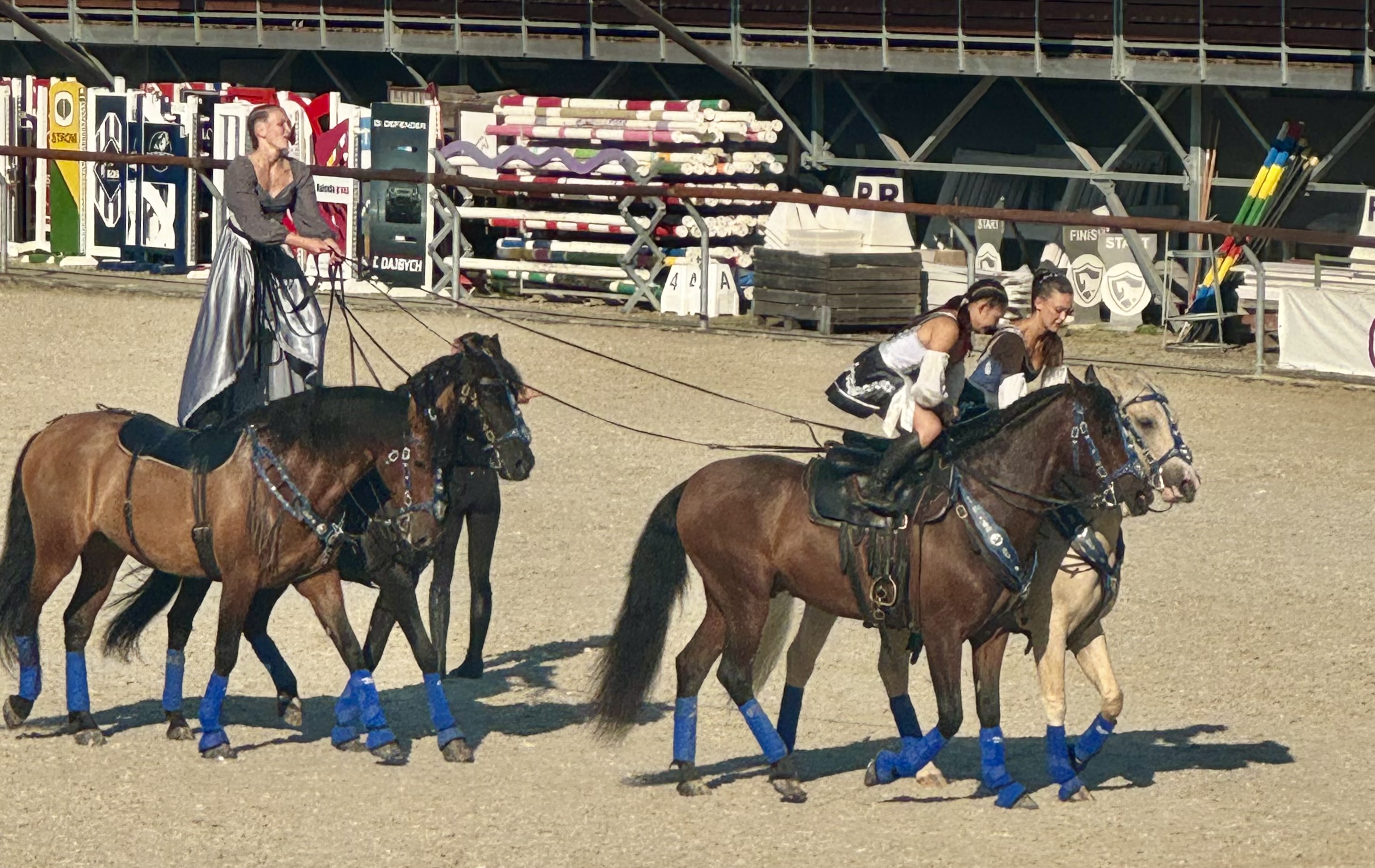 Speciální jezdecký program začal v půlce odpoledne v areálu Královického jezdeckého dvora, kde návštěvníci zhlédli kočárové vystoupení, psí agility, kaskadérské ukázky, ukázky španělského jezdectví, skokové Mini-maxi a sokolnická vystoupení.