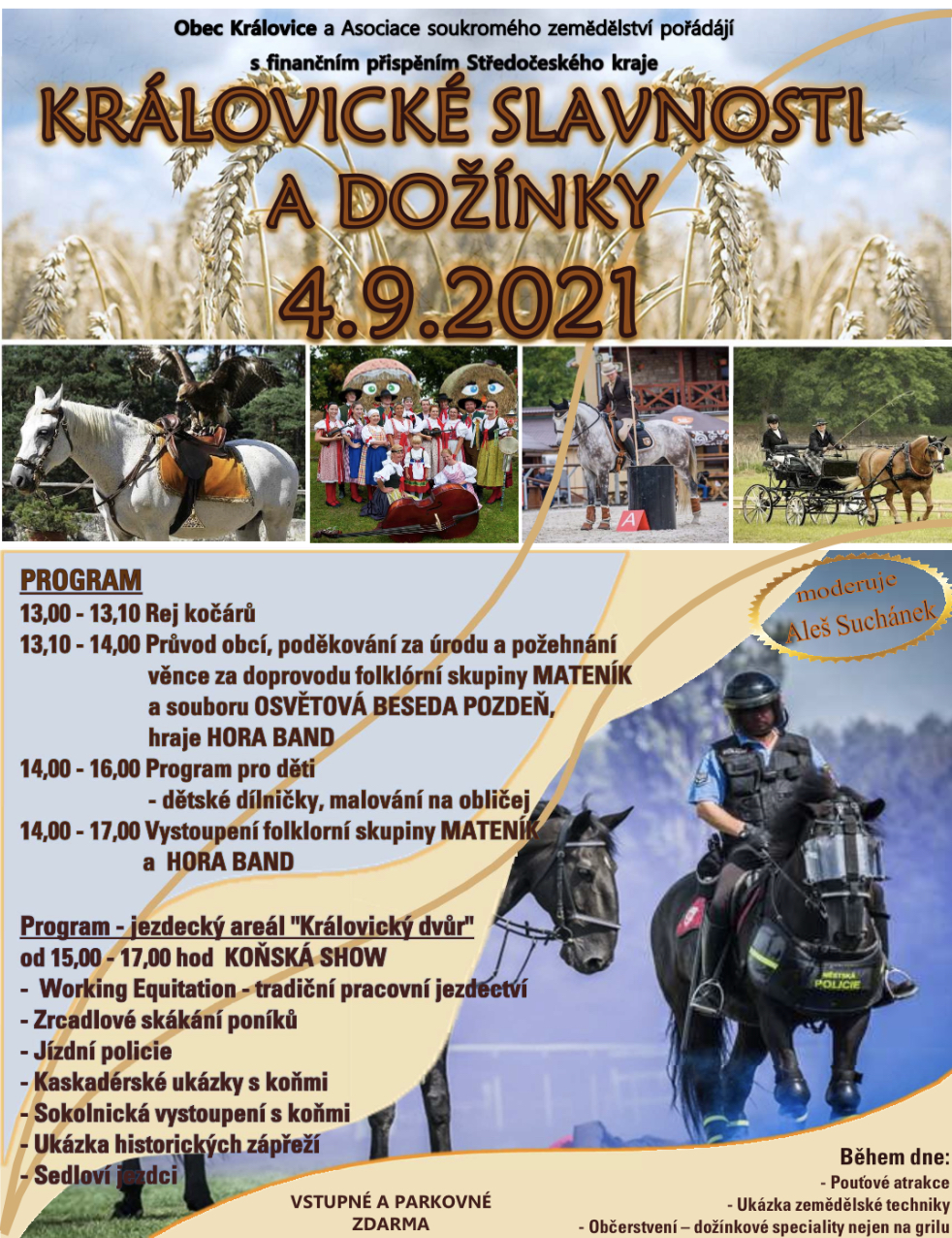 Obec Královice pořádala v sobotu 6. září tradiční Královické slavnosti a dožínky. Program zahájil odpoledne rej kočárů, následovaný průvodem obcí, poděkováním za úrodu a požehnáním věnce za doprovodu folklorní skupiny Mateník. Nechyběl program pro děti, malování na obličej a dílničky.