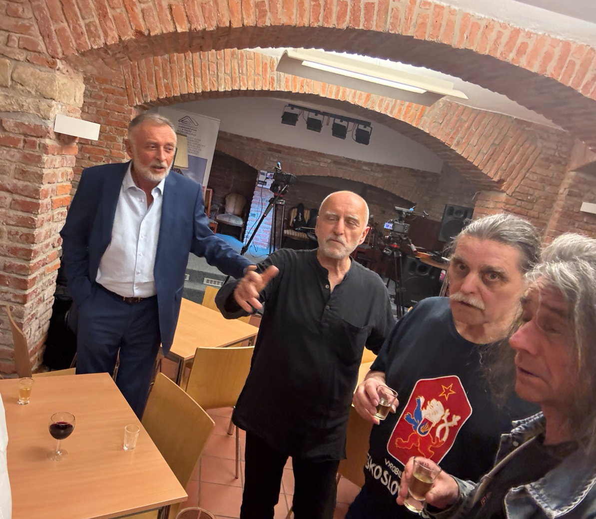 Včera večer jsme hráli koncert jako tradiční vzpomínku na Karla ve Slovenském domě v Praze = jako loni 13. dubna právě s účastí Jožky Banáše, který letos nemohl přijet. Jinak dík všem, co nám s koncertem pomohli a dík divákům, že si přišli zavzpomínat na Karla, zazpívat si s námi Karlovy songy a uctít Karlovu památku. Osobně jsem velmi ocenil, že tolik Pražáků v pátek večer v takměř letním počasí nejelo na chalupy, chaty, zahrádky, apod., ale dali přednost kultuře a hlavně odkazu Karla Kryla = já tvrdím už zhruba 30 let, že Karel Kryl je Mistr Jan Hus naší doby. Coby bezmála 70ník v režimu stará duchna už si můžu dovolit zapomnětlivost (kromě textů ???? včera jen jednou) ataxem v pátek ráno pověřil tu moju, aby naložila do kufru i bublinkovou minerálku zn. PELLEGRINI ???? a že pár lahví dám kolovat do publika hnedka na začátku koncertu. ALE dal jsem je za piáno, apaxem si jich tam nevšiml a zapomněl na ně ... což mě mrzí ještě teďka. Právě jsme se vrátili do štatlu Šalingradu a v neděli ráno obvykle "snídáme" kaviár a šampaňské = řečeno s panem Werichem: "... protože ono není nic dražšího ..." ???? pane Werich, už tu zase JE něco dražšího > třebas na pumpě u 9 křížů litr plnotučnýho benálu za 48 ká a něco, což s přídavkem dobrých aditiv je přes pade ... a protože stará duchna pije starý víno, žere plesnivý sejry a jezdí sporťákem bez střechy, čili Brno - Praha na 1 nádrž neotočíte, taxe naplňuje i další moudrost pana Wericha z té forbíny o tom pomalým metabolismu 603: "... a napište tam, že mám dva, ať maj vztek ..." ???? A už jako bych slyšel Karla Kryla, jak s grácií pana Wericha v rudým koutku naší kuchyně říká: "... No, vona ta 5kolka musí inzerovat to 1 o kolečko víc, protože všichni její členové maj právě o to 1 kolečko míň, ale i tak jim to ékonomicky furtumfurt ňák nic moc nevychází ... Jaxe máte, Vondrovi & spol.? ..." ????