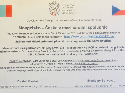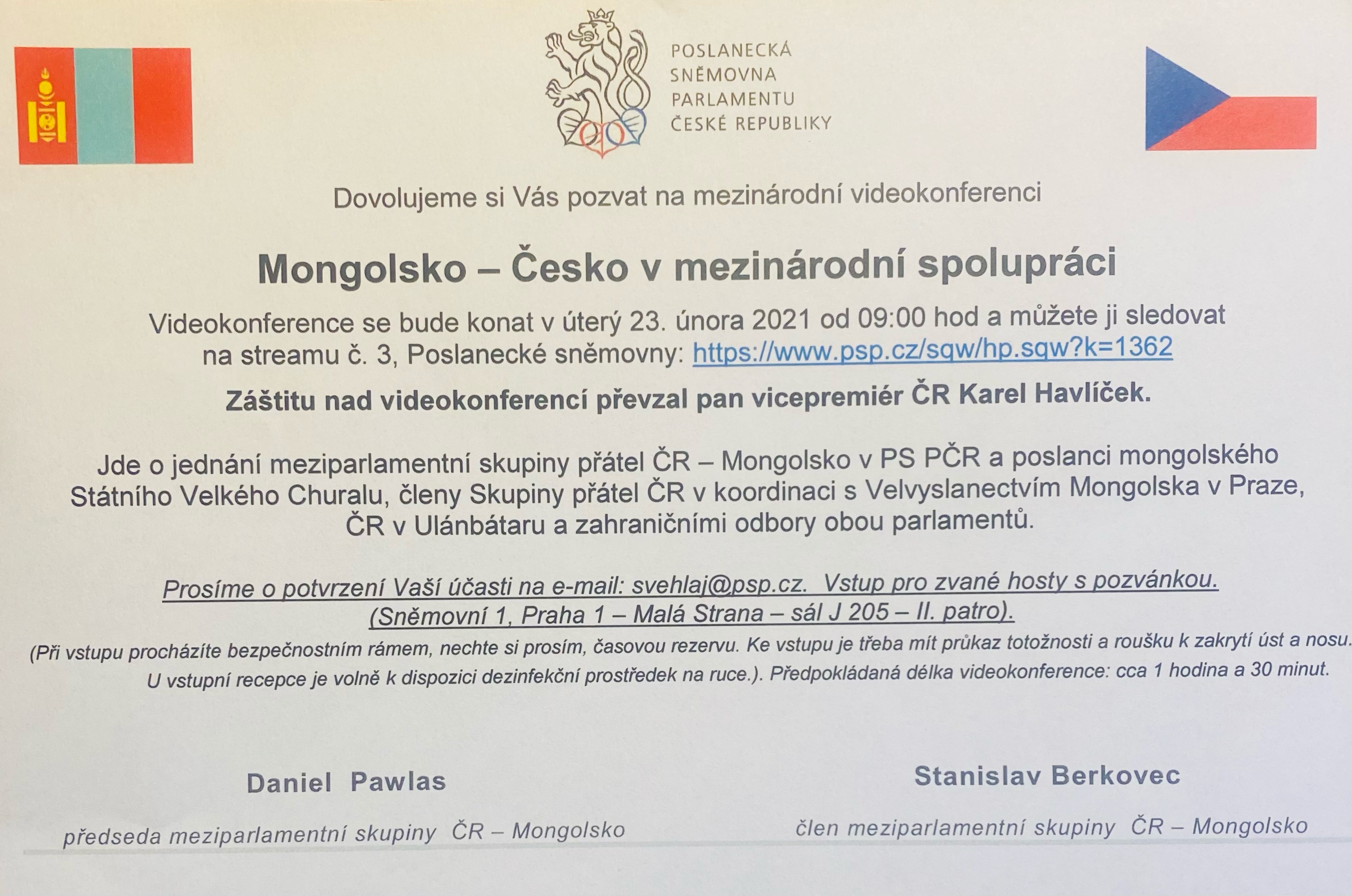 Vztahy mezi Mongolskem a Československem i Českou republikou trvají dlouho a vždy byly přátelské. Ať už na poli diplomacie, obchodu, studijních stáží, vědecké spolupráce, pracovních pobytů a dalších oblastí. V roce 1953 byl do Mongolska vyslán první československý velvyslanec. Formálně vznikly 25. dubna 1950 mezi tehdejším Československem a Mongolskou lidovou republikou. Československo bylo až do druhé poloviny 80. let po SSSR druhým nejvýznamnějším mongolským obchodním partnerem. Po rozdělení Československa v roce 1992 Mongolsko navázalo v roce 1993 vztahy s Českou republikou. Česká republika má velvyslanectví v Ulánbátaru. Ale vždy to byly vztahy, založené na osobních kontaktech a vzájemné znalosti obou zemí. Poprvé jsem se o tom přesvědčil jako rozhlasový redaktor na své cestě do Mongolska v roce 1988. Na filozofii těchto vztahů se nezměnilo nic – přestože obě naše země prodělaly od té doby bouřlivý vývoj. Jsem moc rád, že jsem mohl pomoci při organizaci videokonference mezi skupinou přátel ČR ve Velkém Churalu a Meziparlamentní skupinou přátel Mongolska v PS PČR. Uskutečnila se díky tomu, že Česká republika má v Ulánbátaru vynikajícího velvyslance – J.E. Jiřího Brodského. Také díky spolupráci mezinárodních oddělení obou parlamentů a obou skupin přátelství. Byla to, žel Bohu, jediná možnost setkání v této nelehké době, která poznamenala život a cestování na celém světě. Na české straně se videokonference zúčastnili za velvyslanectví Mongolska v Praze Chargé d´affaires a.i. pan Uuganbayar Davaasambuu a pan Pagva Bira Ph.D. Poslaneckou sněmovnu zastoupil předseda skupiny přátel Mongolska p. Daniel Pawlas a její členové pánové Milan Pour a Stanislav Berkovec spolu s p. Michalem Ratiborským. Společnost přátel Mongolska reprezentoval p. Dr. Jiří Šíma, Asociaci obranného a bezpečnostního průmyslu p. Daniel Svoboda a společnost Shark, vyrábějící ultralehká letadla p. Petr Hýl. Na mongolské straně to byl předseda česko-mongolské skupiny přátelství poslanec Battumur Enchbajar, poslanec Enchtajvan Bat-Amgalan, poslanec Sajnchú Ganbátar, J.E. velvyslanec ČR v Mongolsku p. Jiří Brodský a jeho zástupce Josef Kostiha.