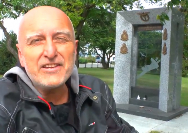 Standa Berkovec dostaveníčko s Jawou u pomníku Československých letců